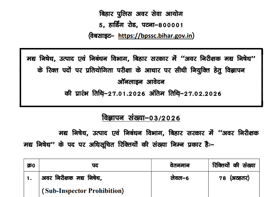 Bihar Police Subordinate Services Commission (BPSSC) released Sub Inspector Prohibition (SI Madhyanishedh) recruitment 2026 notification (Advt No: 03/2026) for 78 posts in Prohibition, Excise & Registration Department, Govt of Bihar. Online applications 27 Jan – 27 Feb 2026.
