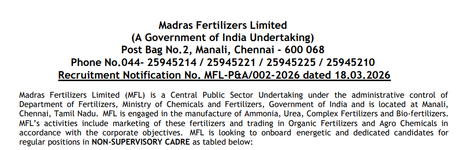 Madras Fertilizers Limited (MFL), Manali, Chennai ने Notification No. MFL-P&A/002-2026 के तहत 43 Non-Supervisory Cadre Posts के लिए recruitment notification जारी किया। Online applications 18 March 2026 से शुरू हो चुके हैं और 5 April 2026 तक madrasfert.co.in पर चलेंगे। No PET/Scorecard mandatory.